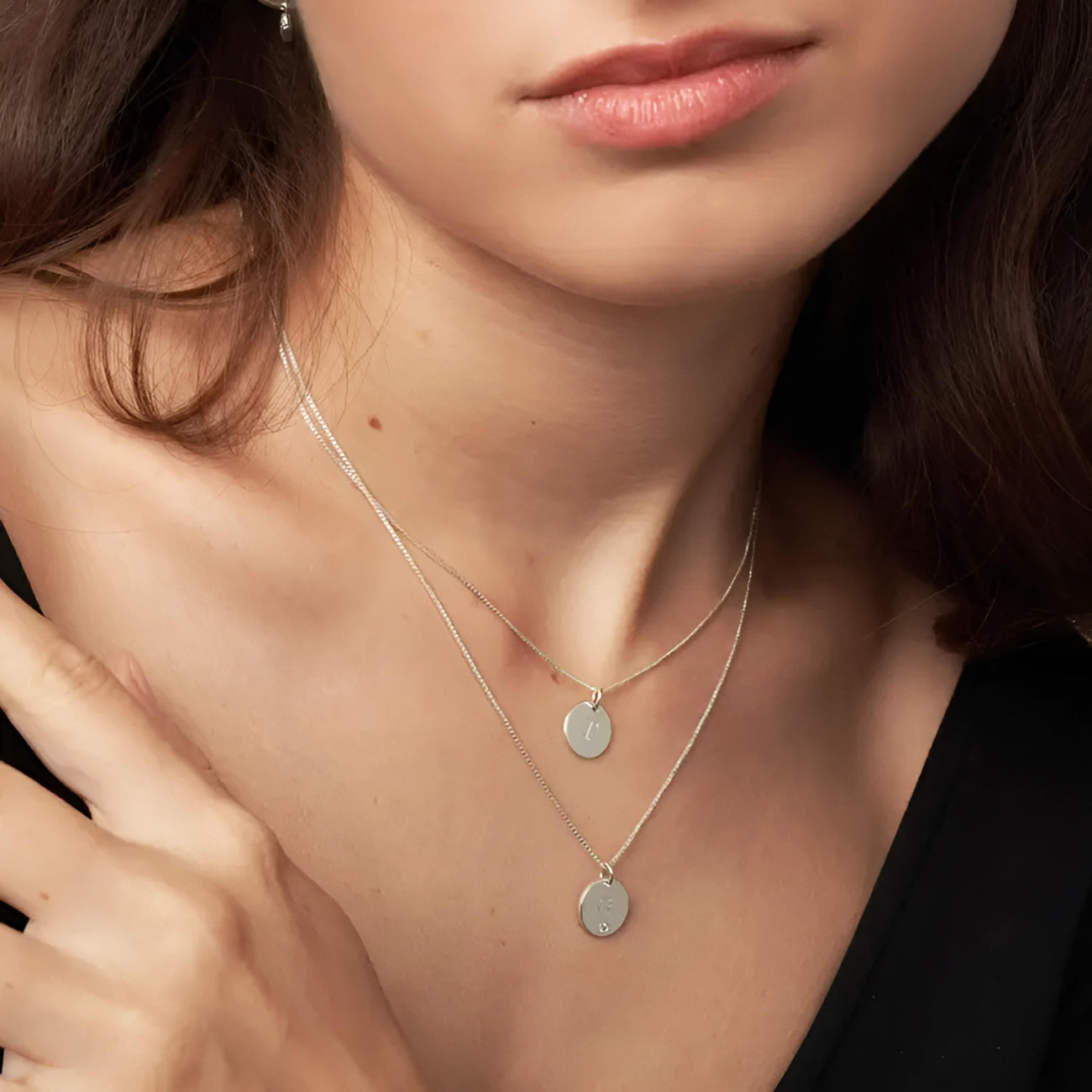 The Klara Disc Initial Necklace with Diamond in Yellow, White or Rose Gold (9K & 18K) is a timeless and versatile piece that adds a touch of elegance to any look. Whether worn daily or for special occasions, this chic accessory will quickly become your go-to. The necklace features a stunning 0.02-carat round-cut diamond, beautifully set on a customizable initial pendant. You can personalize it with up to three discs/letters, making it a meaningful investment you'll cherish for years to come.
