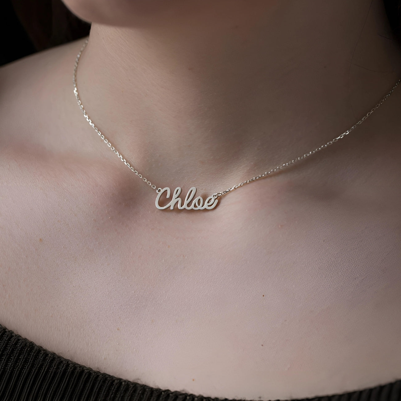 The Yarra Name Necklace in 9K or 18K White, Yellow, or Rose Gold showcases an elegant cursive script, adding the perfect touch to your signature style.